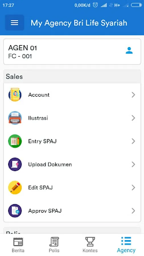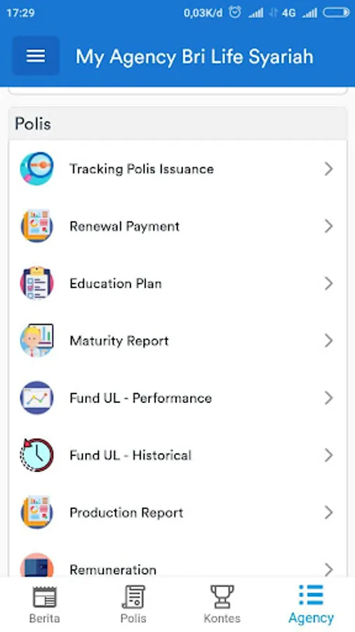 Fitur yang tersedia ilustrasi produk,entri data,verifikasi,monitoring, kontes, tracking polis, remunerasi.