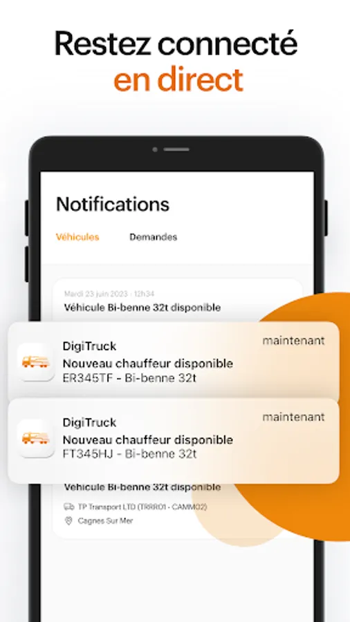 + Optimize your schedules with DigiTruck: the application notifies you when a driver has finished his transport. You can therefore offer him a new mission.