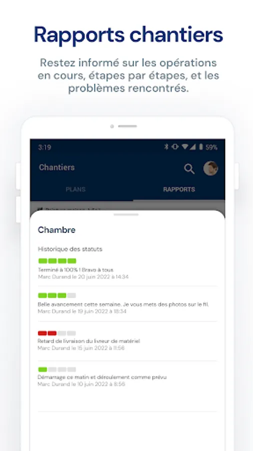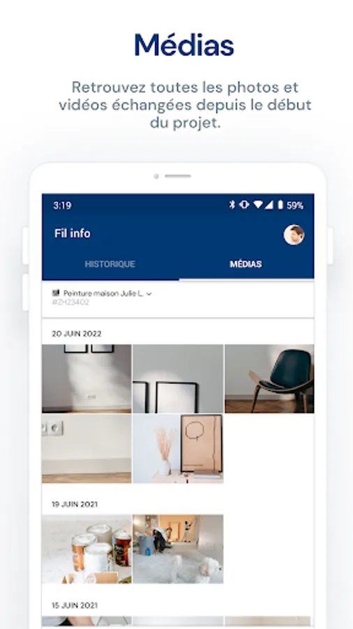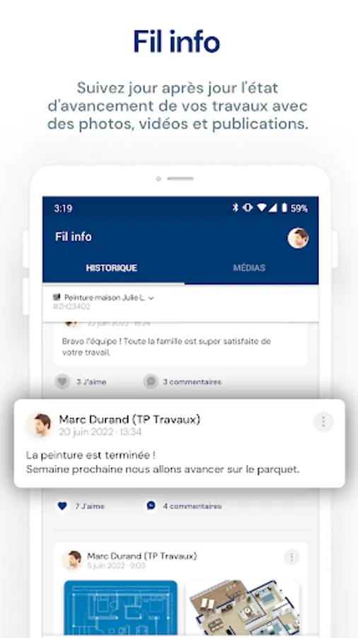 The Fil info allows you to exchange with the entire team in charge of your work, to publish messages, photos or videos and to respond to them in the comments. A real social network dedicated to your site.