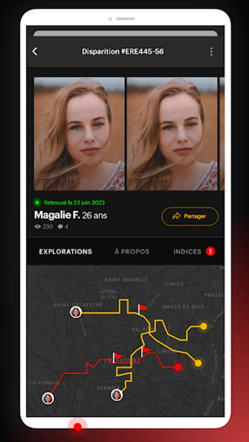 You too, you can participate ! Launch the investigation mode explore the surroundings in search of people, animals or missing objects near you.