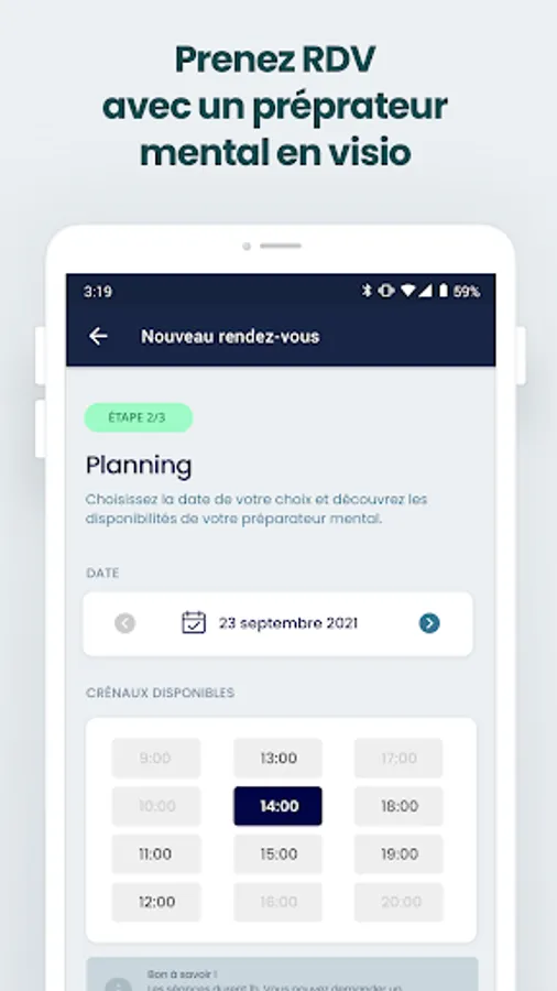 Our experts will accompany you in a personalized way! To do this, simply book your session online on the date of your choice. A mental trainer will then be at your disposal to work on the theme of your choice with the tools of the application and other more advanced ones.