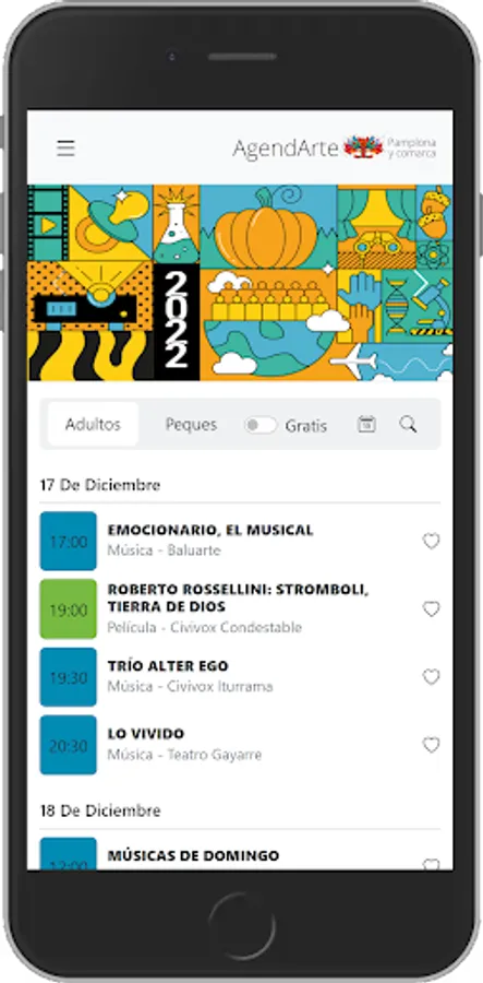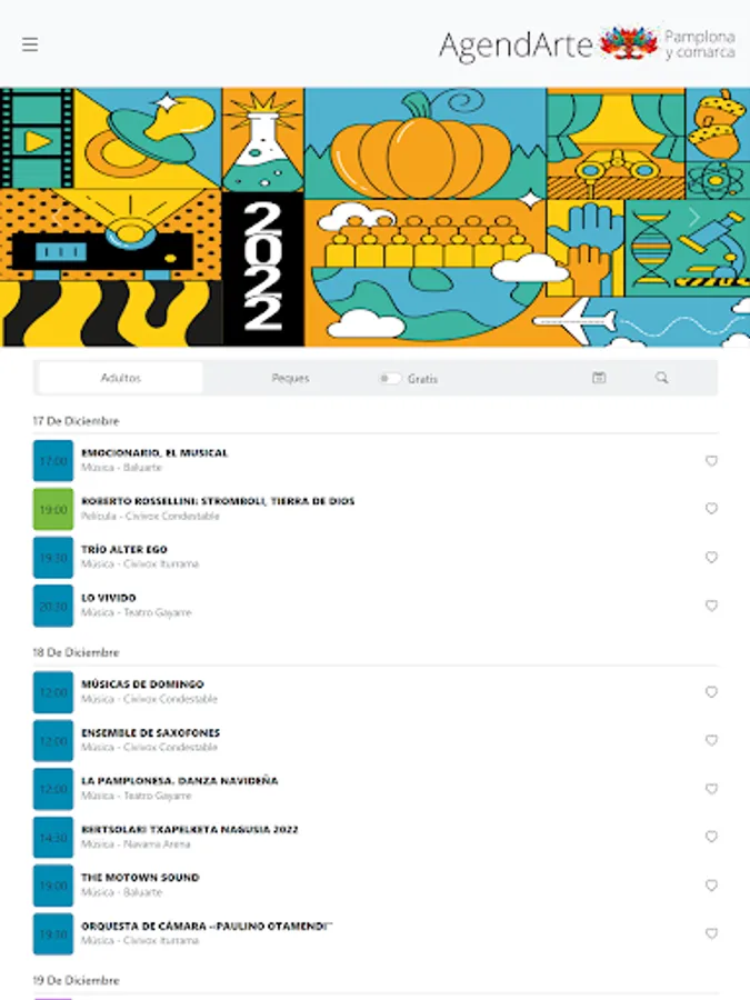 Free digital agenda that collects all the events in Pamplona in the same APP. Updated daily, with schedules, prices and address of all events. Activities for all ages. Know everything that happens in your city and the spaces that organize activities and events. Are you going to miss it?