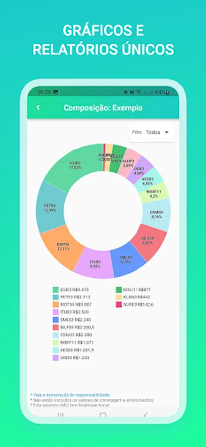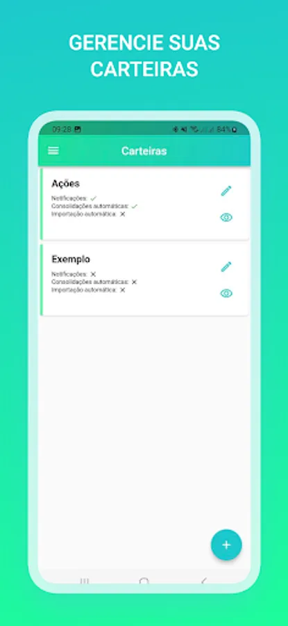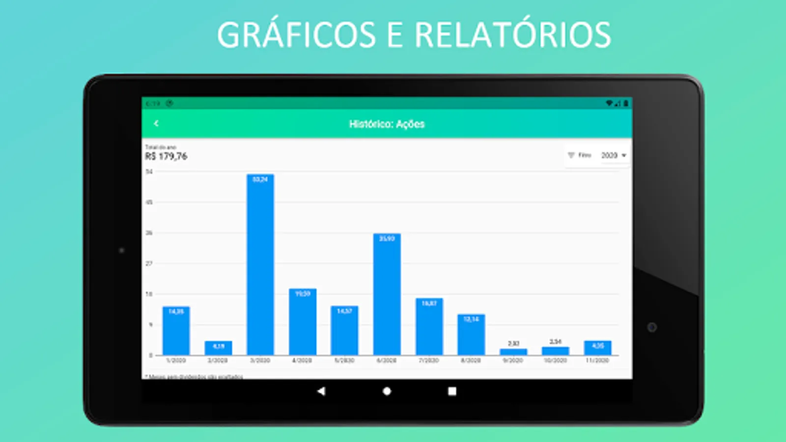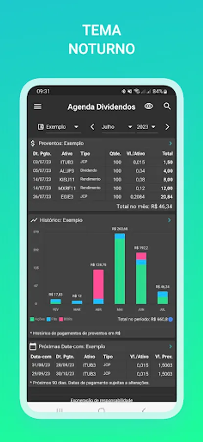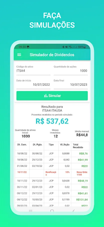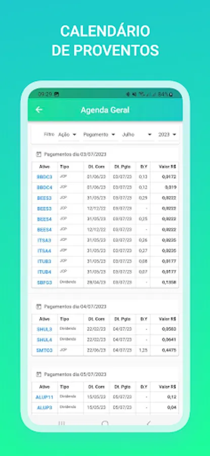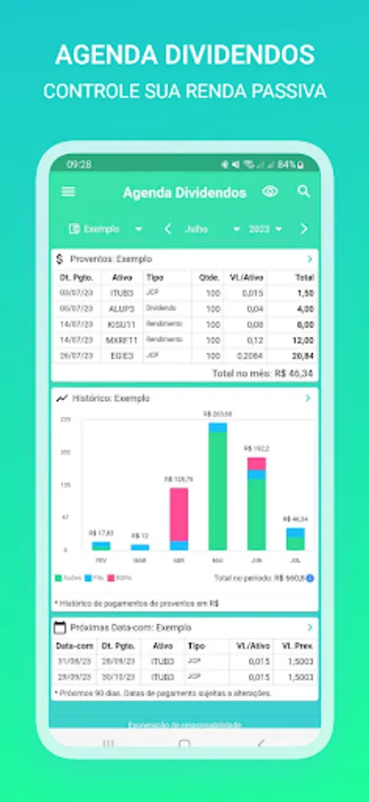 The application allows you to register your portfolio of assets and track the payment schedule of dividends and interest on own capital, all in a simple and intuitive way.