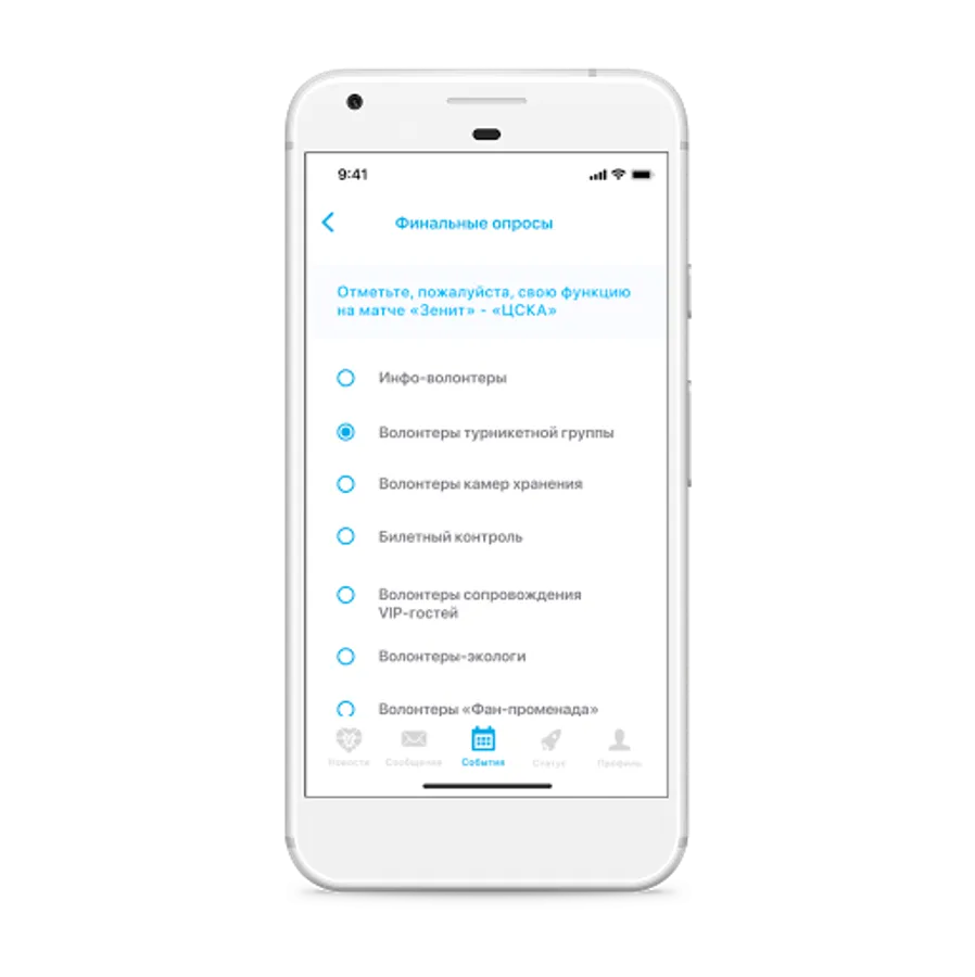 The VolZenit mobile application is intended for volunteers of Football Club Zenit, created for the convenience of communication between those who assist in holding events at the Gazprom Arena and at the Smena stadium.