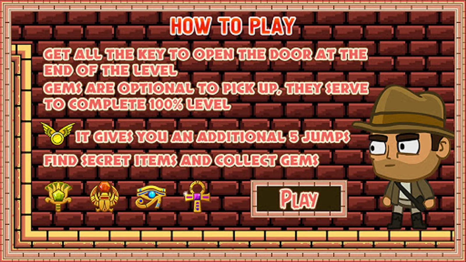 Mr. Lupato goes on a trip and needs your help to find Egyptian Pyramids treasures. Help him to jump and get all gems and keys. Open the door at the end of each level and get stars. Don't miss additional jumps, find secret items and collect beutiful gems. Complete all levels and enjoy this exciting adventure and funny platformer.