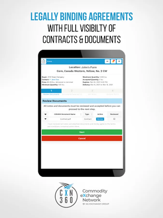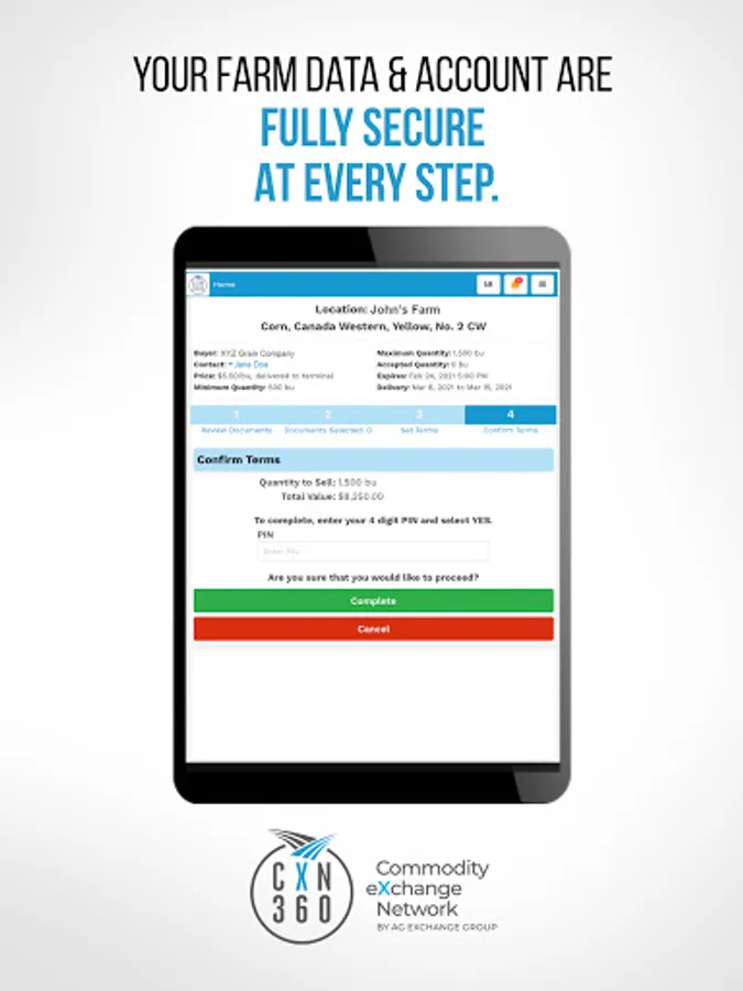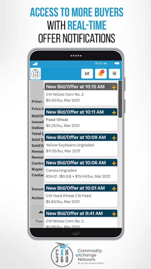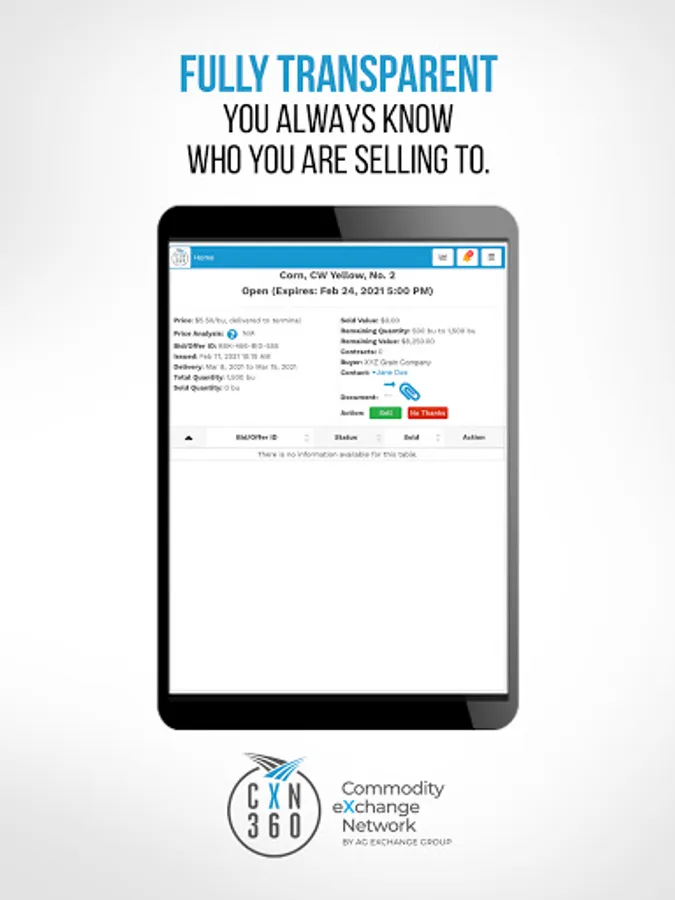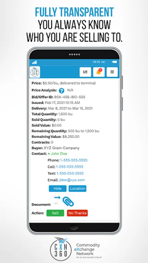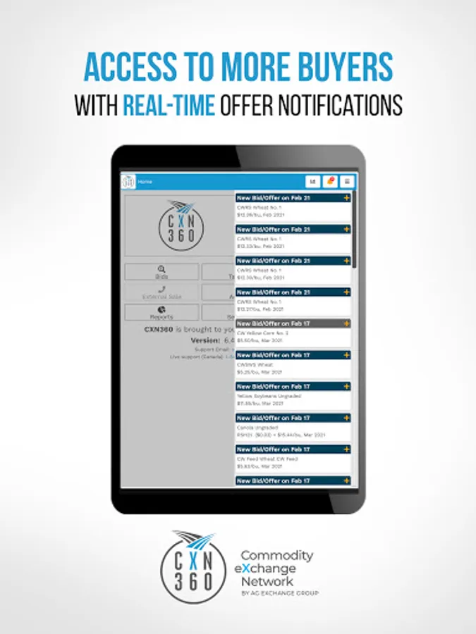 On CXN360, members can connect with grain buyers and receive bids to buy your grain. You can also issue offers to sell; you control the quantity and the price.