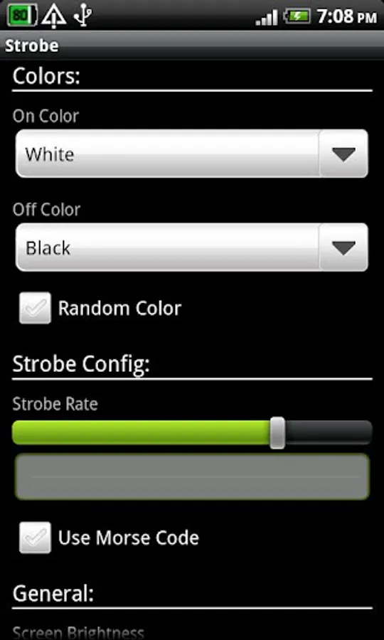 In need of a strobe light? Use this app to flash your screens background on and off in Morse code or at a set rate! Choose an on color and off color, or have them randomly selected