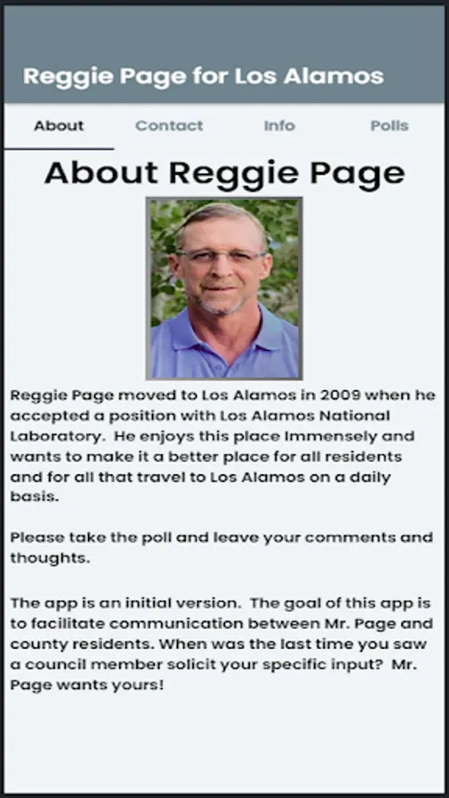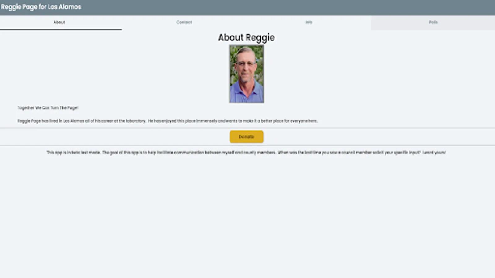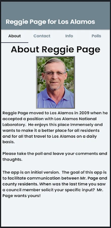 In order to break down communication barriers, this app seeks to provide a direct line of communication to Reggie Page. He wants to hear the voice of the members of Los Alamos County, and this app is the venue.