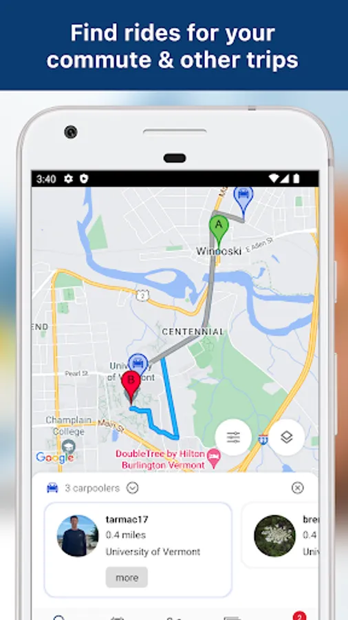 Members of the Chittenden Area Transportation Management Association (CATMA) can download the CATMA app to find rides, record trips, and earn rewards throughout Chittenden County, Vermont.