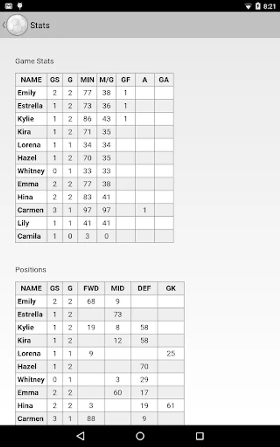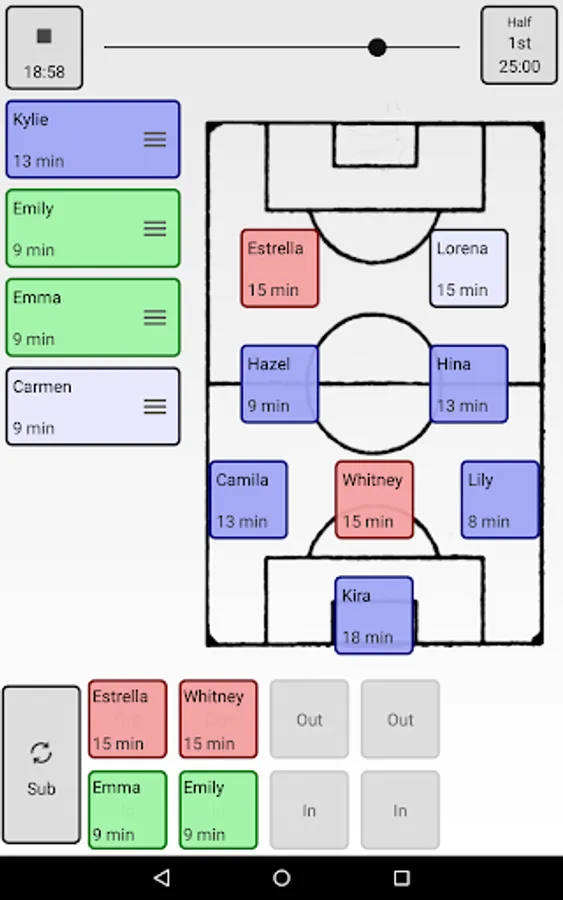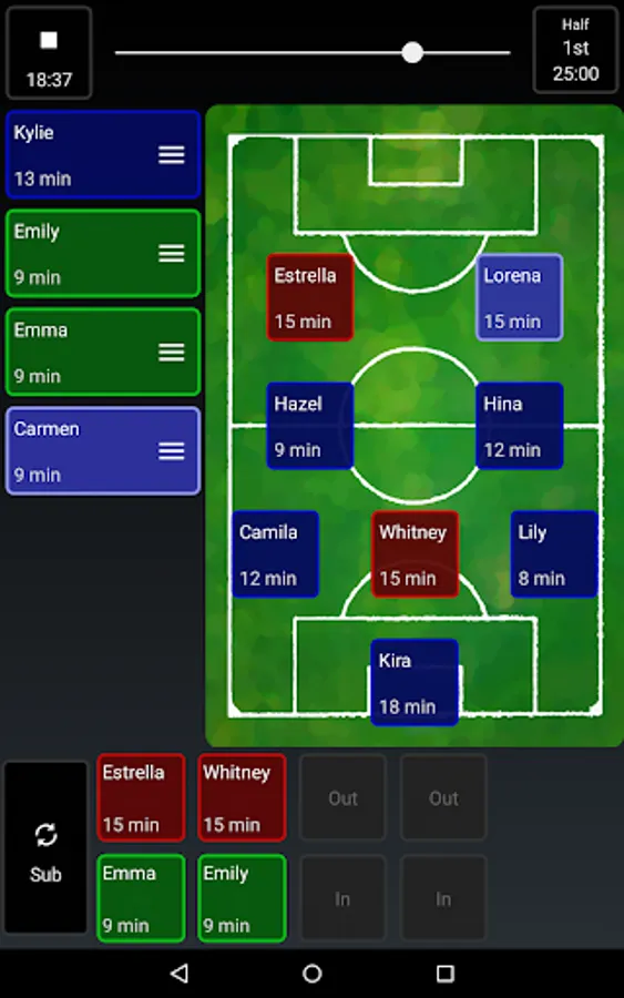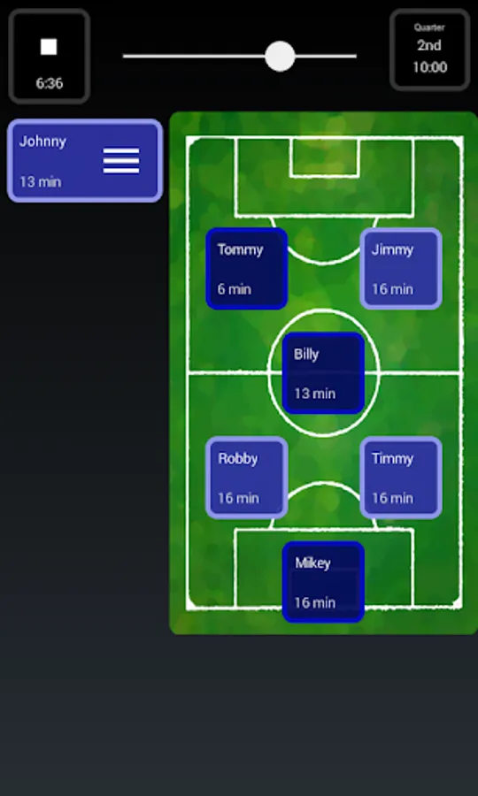 Soccer Snap makes game-time easy. It allows coaches to simply and easily track their players during games--what positions they play, how many minutes each player has been on the field, goals scored and other key stats. Substitutions can be made on-the-fly or at stoppages, and Soccer Snap will highlight players who have been on or off the field the longest, so you don't have to track it yourself.