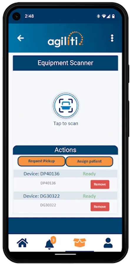 • Equipment barcode scanning – assign equipment to patients and request pickup, or scan for repair service requests