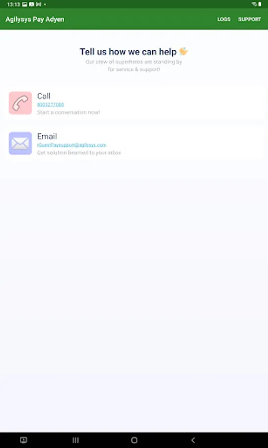 Merchants should download the POS app in their android device and then download Agilysys Adyen Payments app. Once the POS app and Agilysys Adyen Payments app are configured/synced then it will be ready to connect to the Adyen gateway devices.