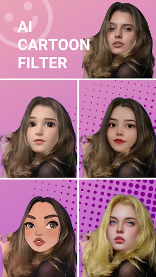 Cartoon yourself with our well-trained AI effects! Just upload your selfie and enjoy numerous cartoon face filters, such as 3D cartoon filters, anime filters, comic effects and more. Make cartoon avatars of yourself for social platforms and explore beautiful photo filters and edit pictures like an artist and an internet celebrity!