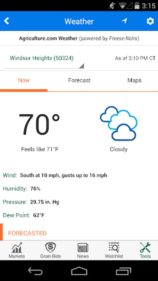 Weather conditions, forecasts, maps, and ag-specific data based on your current location.