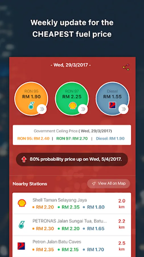 - You get the instant access to the cheapest petrol price at nearest petrol station