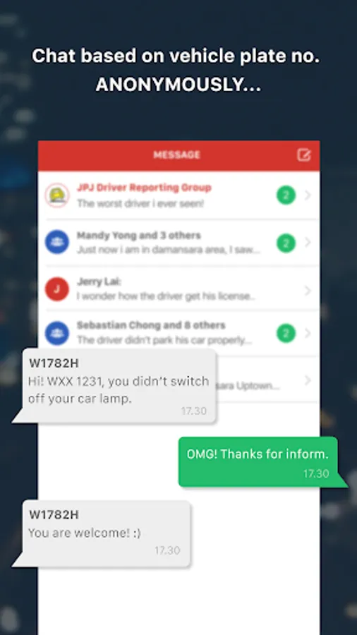 - You can chat with others drivers by vehicle plate number in anonymous manner, get notified about stuff like head lamp is not switched off in a mall or tyre is running out of air