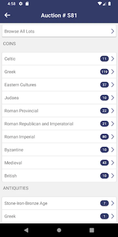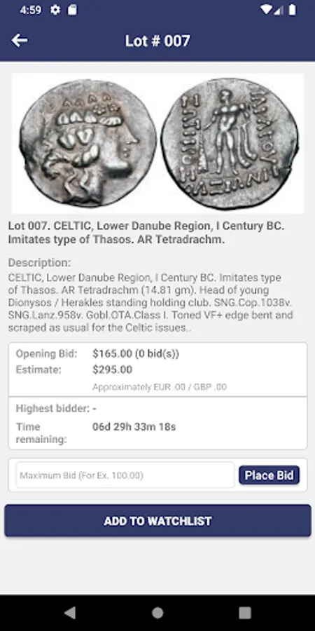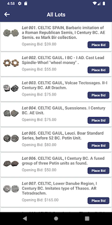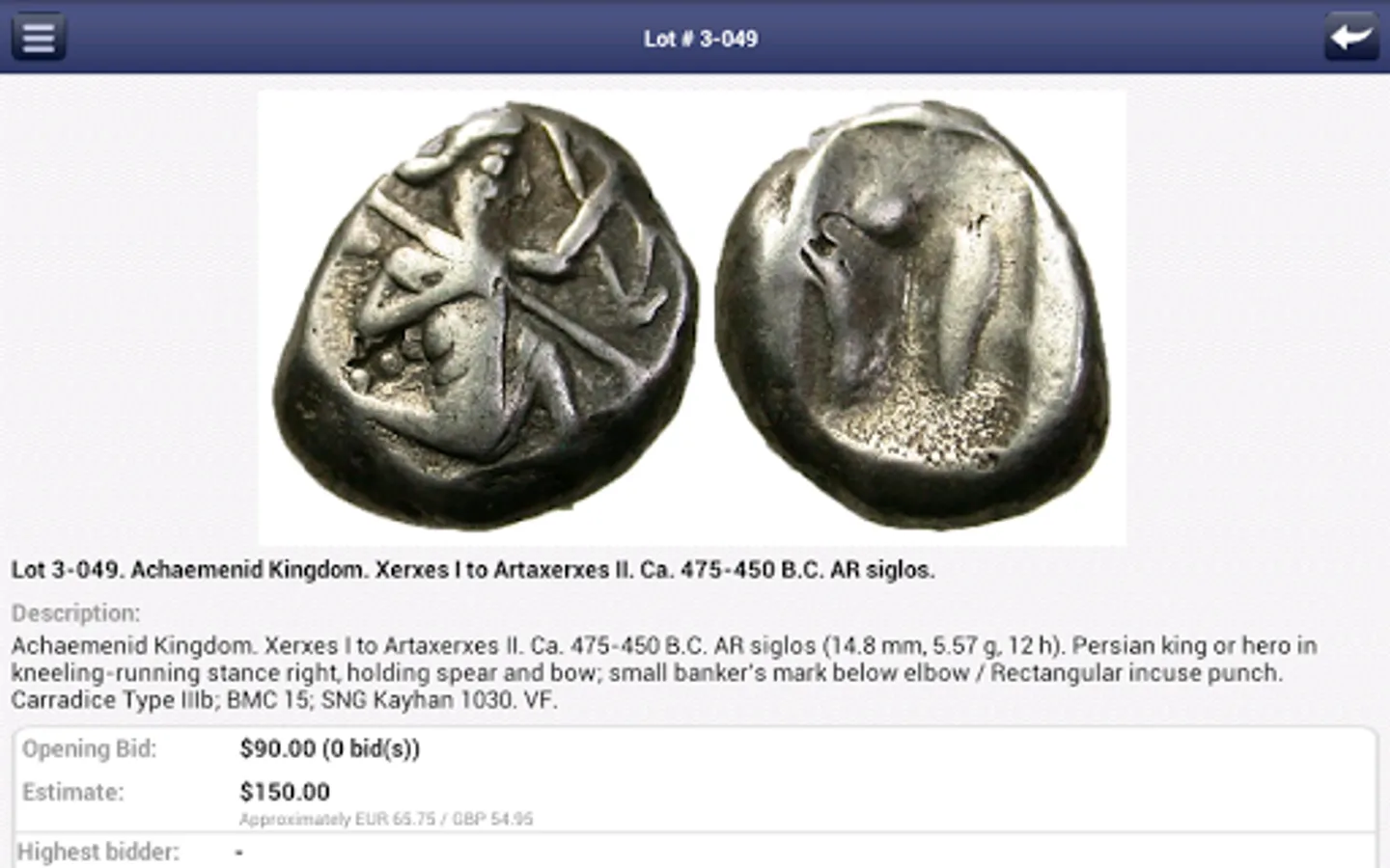 An online auction for coins (numismatics) and antiquities (other collectibles coming soon). Place and track your bids, get outbid notifications, track your consignments all from this easy to use app.