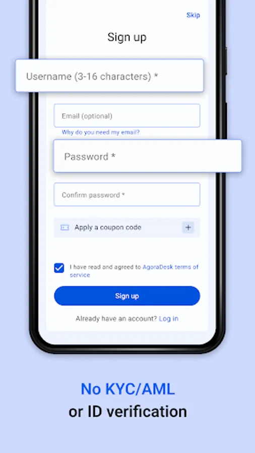 AgoraDesk is committed to maintaining the simplicity and straight-forwardness that made the original LocalBitcoins so popular. We do not employ KYC/AML, nor do we ever plan on doing so.