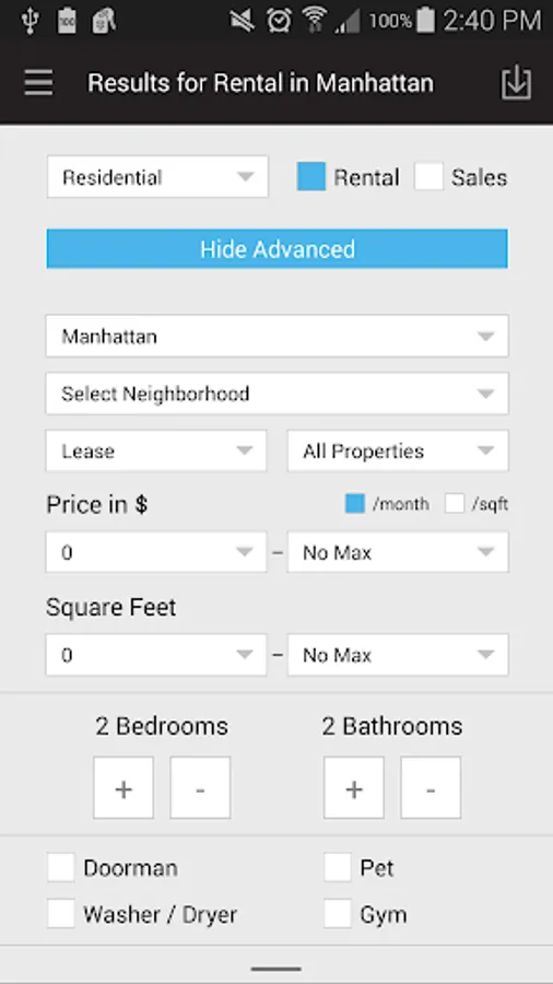 - Filter search results by Neighborhood, Listing Type, Property Type, and Square Footage.