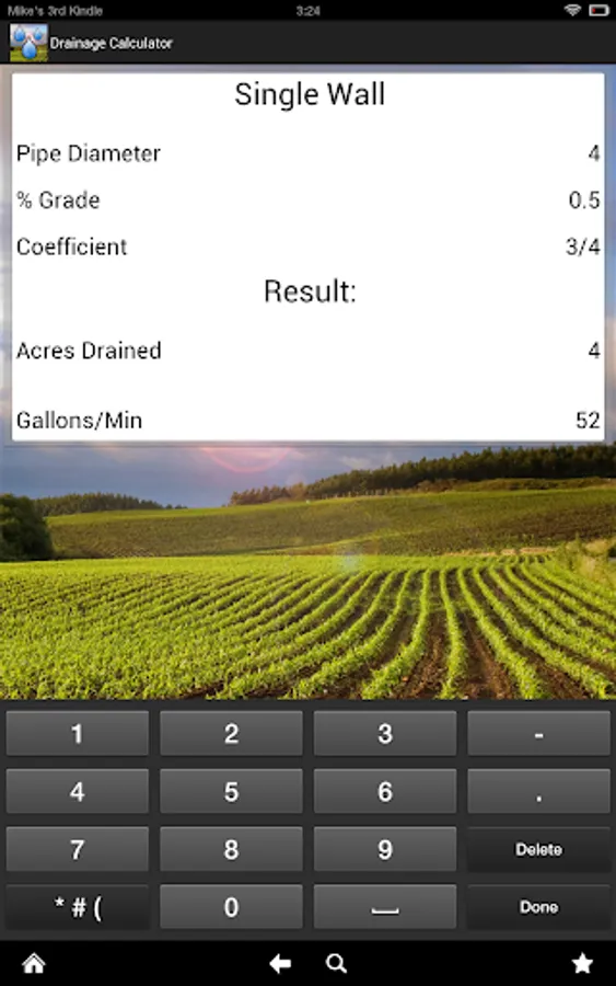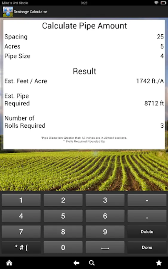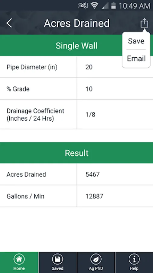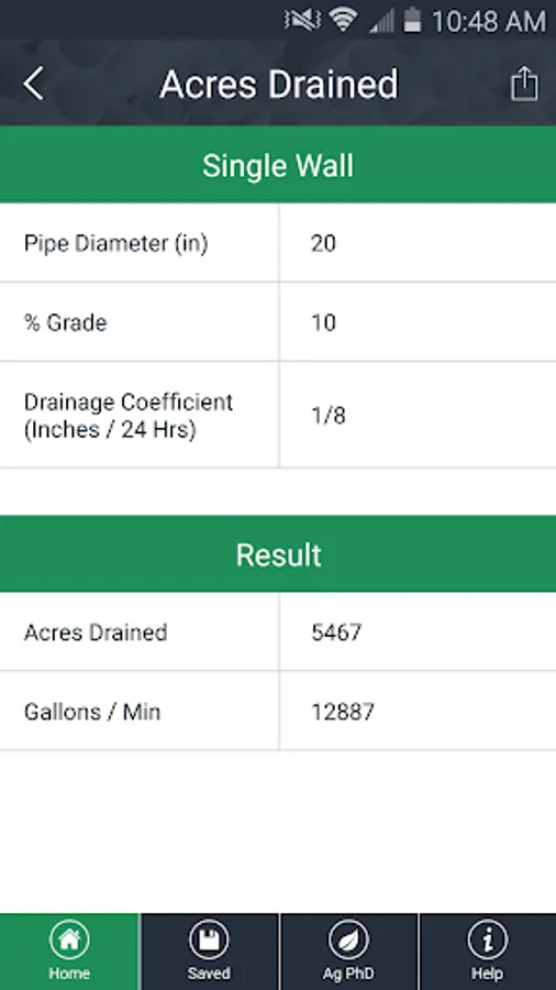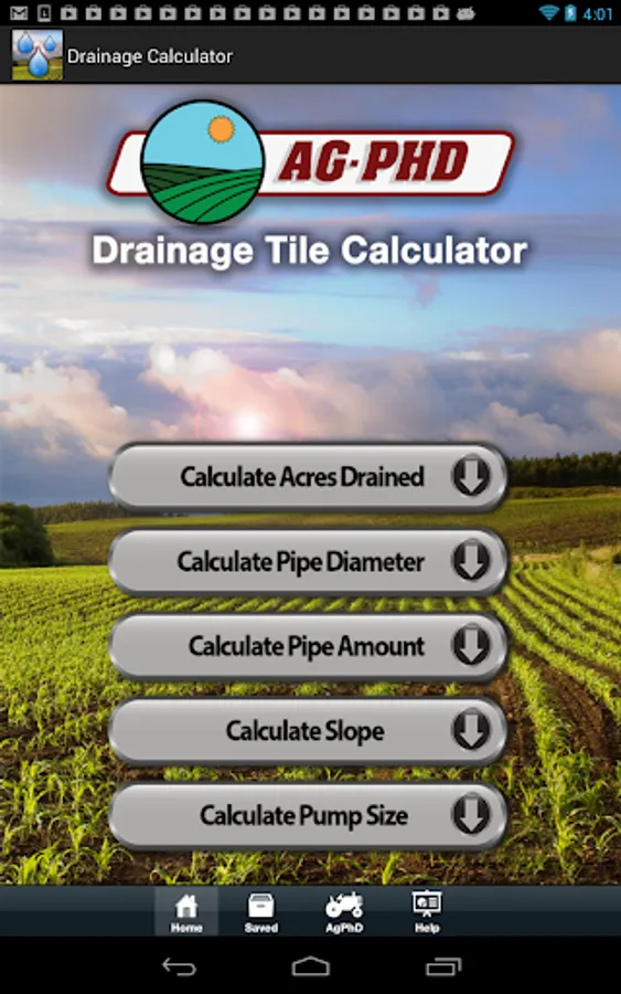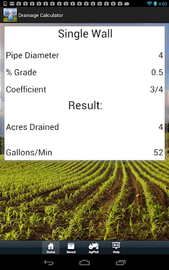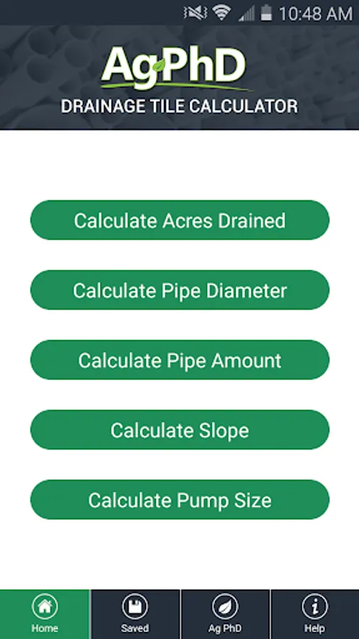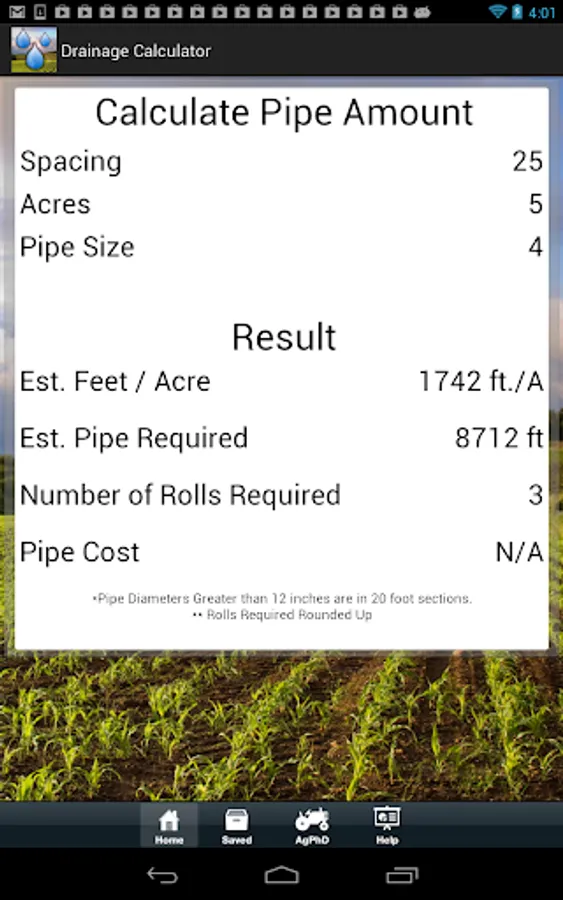 The Ag PhD Drainage Tile Calculator helps you determine your tile supply and capabilities for your field drainage project. You can calculate acres drained for single wall and dual wall tile in any size and grade, the pipe size needed to effectively drain acres, and the length of pipe you will need to purchase to complete your project.