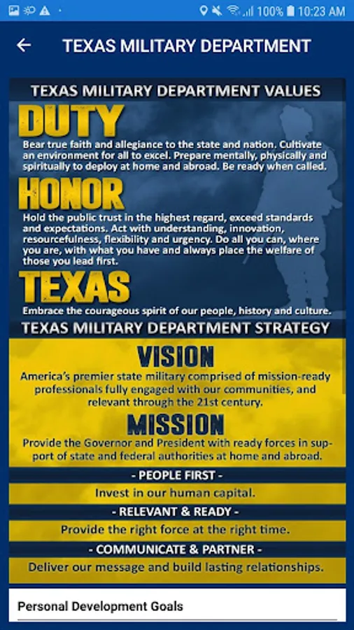 The Texas Military Department is comprised of the Texas Army National Guard, the Texas Air National Guard, the Texas State Guard, and the Domestic Operations command. The Texas Military Department (TMD) app connects the online community with information about TMD, including leaders, events, and news. Join the online community and keep up-to-date on stories, photos, videos, notifications, and leadership, and help the community grow by sharing content of your own.