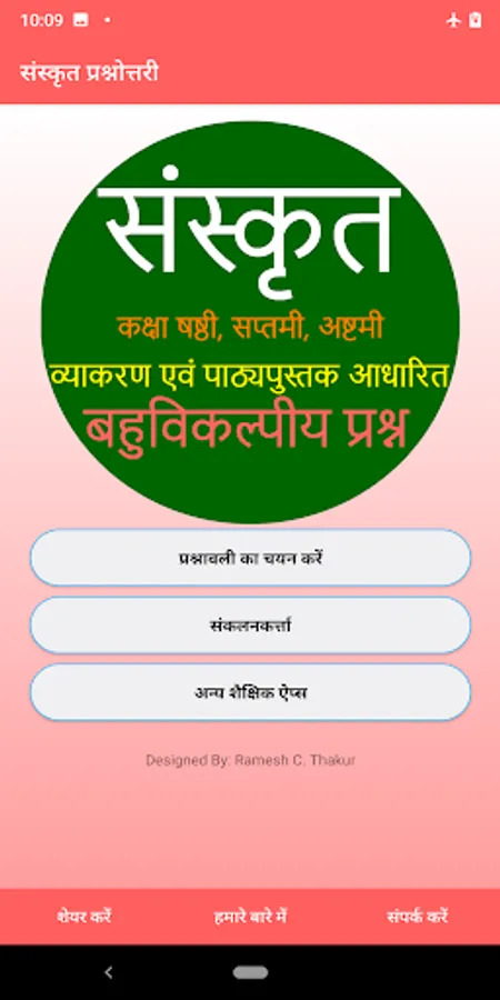 संस्कृत विषय को सुरुचिकर बनाने के लिए एक नवीन एप्प (APP) का सृजन किया गया है । यह ऐप्प (APP) छठी से आठवीं के छात्रों के लिए उपयोगी तथा लाभकारी है । यह व्याकरण तथा पाठ्य पुस्तक पर आधारित है । इस ऐप्प में तीस प्रश्नोत्तरियों का समावेश किया गया है । इस ऐप्प में प्रत्येक प्रश्न के चार उत्तर दिए गए हैं , आपको सही उत्तर का चयन करने के लिए किसी एक को क्लिक करना है । आइए, खेलिए और अपना संस्कृत- ज्ञान बढ़ाइए।...