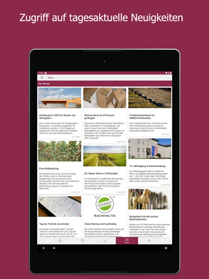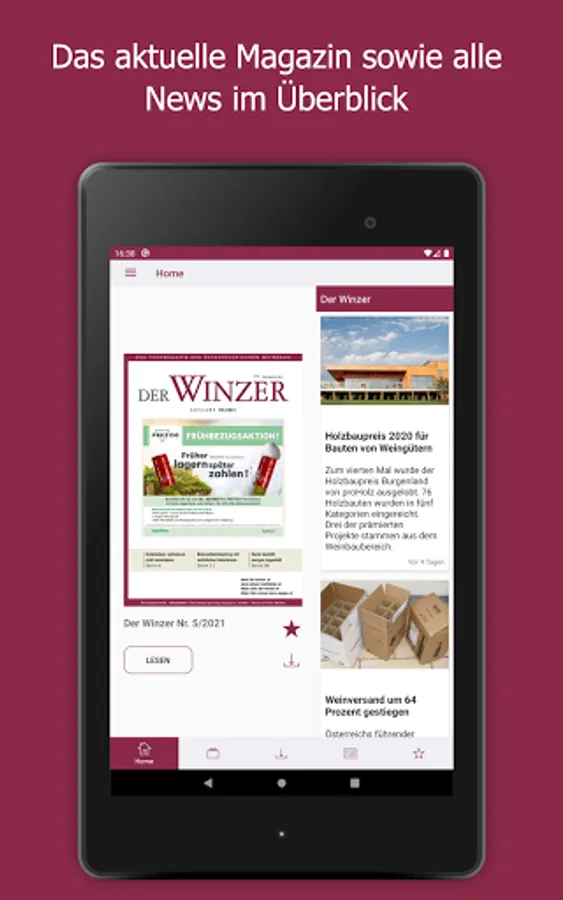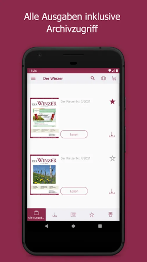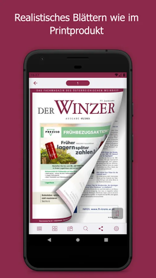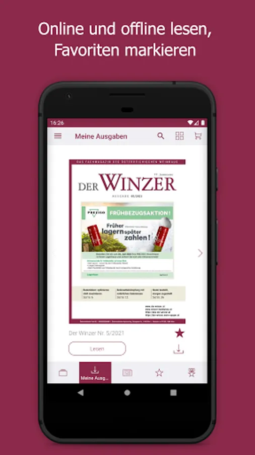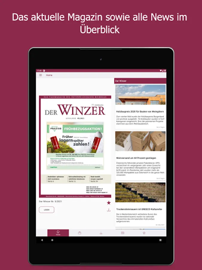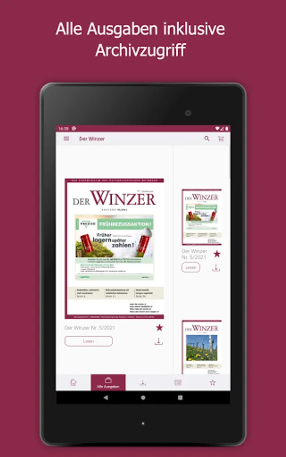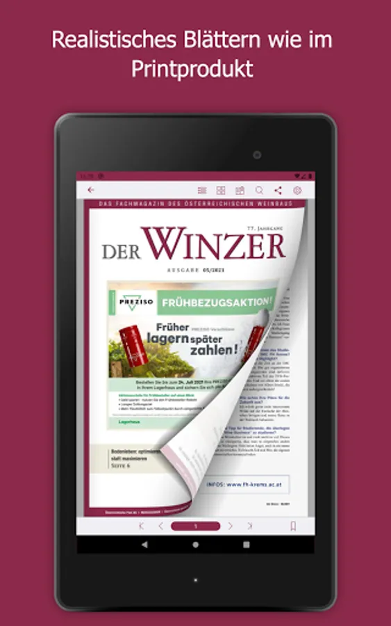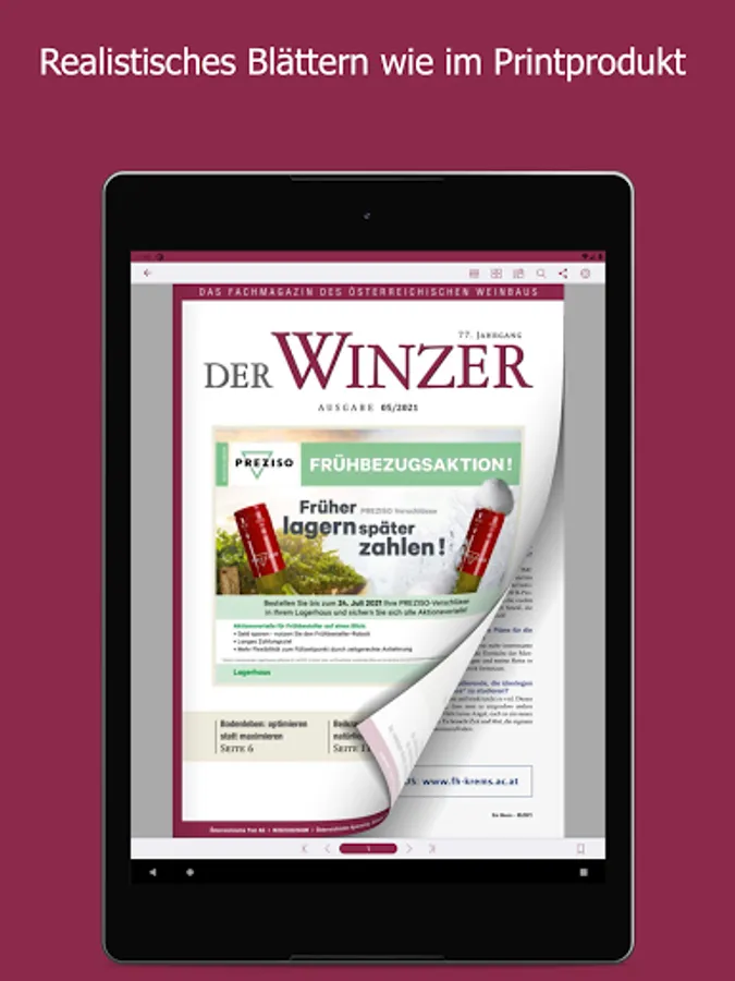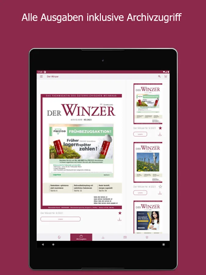 As the largest German-language trade journal on viticulture, DER WINZER is at the pulse of the wine season. On the way to top quality wine, it conveys current specialist content from the areas of viticulture, cellar technology, marketing, business and wine management. The monthly print magazine has the function of a competent consultant in the industry. The DER WINZER app enables electronic purchase of an e-paper so that you can stay up-to-date even earlier and on the go - including archive access back to 2012. As a subscriber to the digital version of the trade magazine, you can register for free within the app. The expenses included in your subscription will then be automatically activated. The e-paper can be purchased as a single issue (€ 8.99), as an annual subscription (€ 83.99), a half-year subscription (€ 42.99) and a quarterly subscription (€ 21.99) ) can be obtained.
