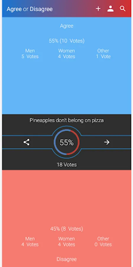 Select do you agree or disagree with other opinions. After you select agree or disagree you can see how other users voted, you can see total votes and votes by men, women and other.