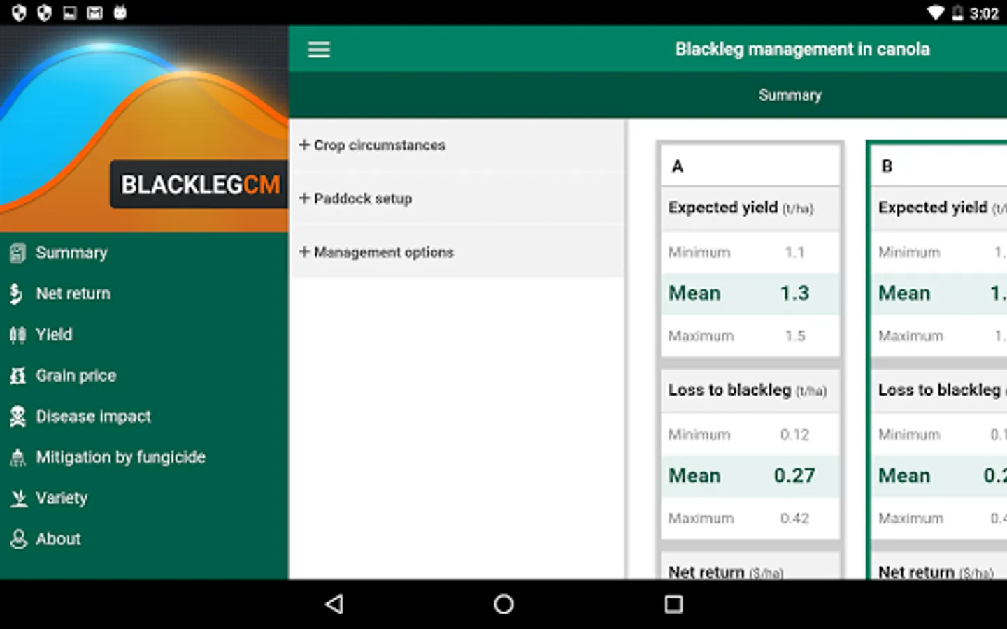 BlacklegCM can be tuned to account for some of the major factors that relate to risk of yield loss due to blackleg disease in your paddocks. It allows you to compare the likely profitability of different disease management strategies including paddock selection, variety choice, seed dressing, banded fungicide and foliar fungicide.