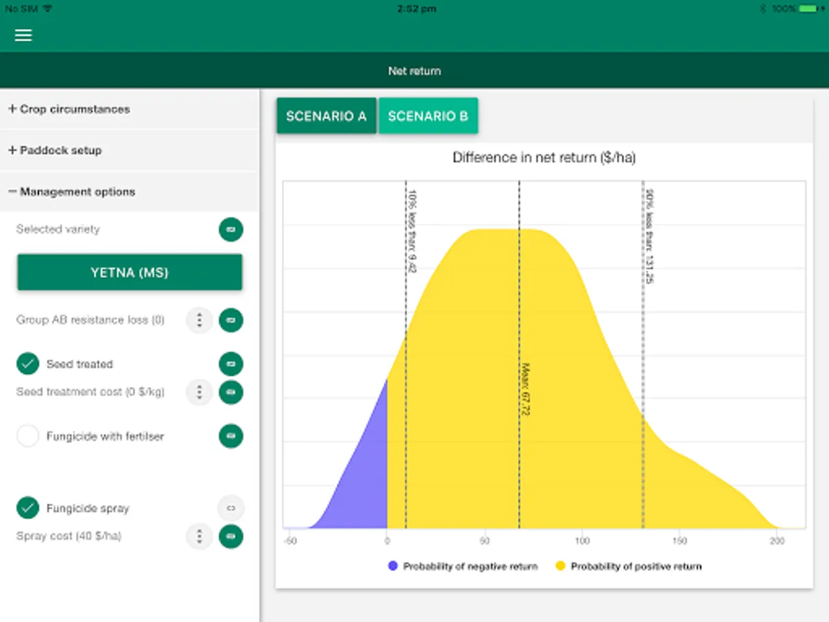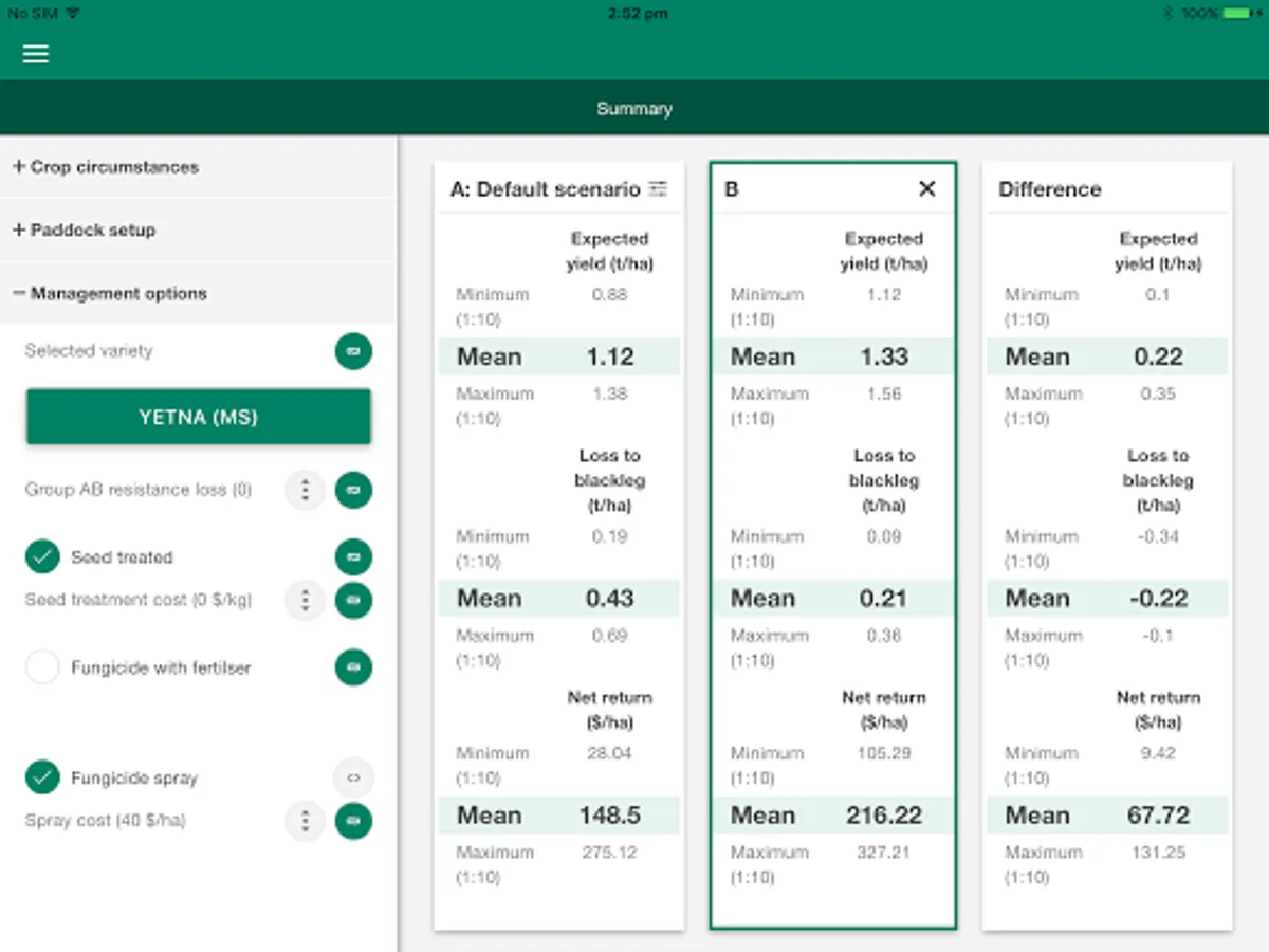 BlacklegCM takes account of costs, yield benefits, grain price, and seasonal conditions to give you best case, worst case and most likely estimates of financial return.