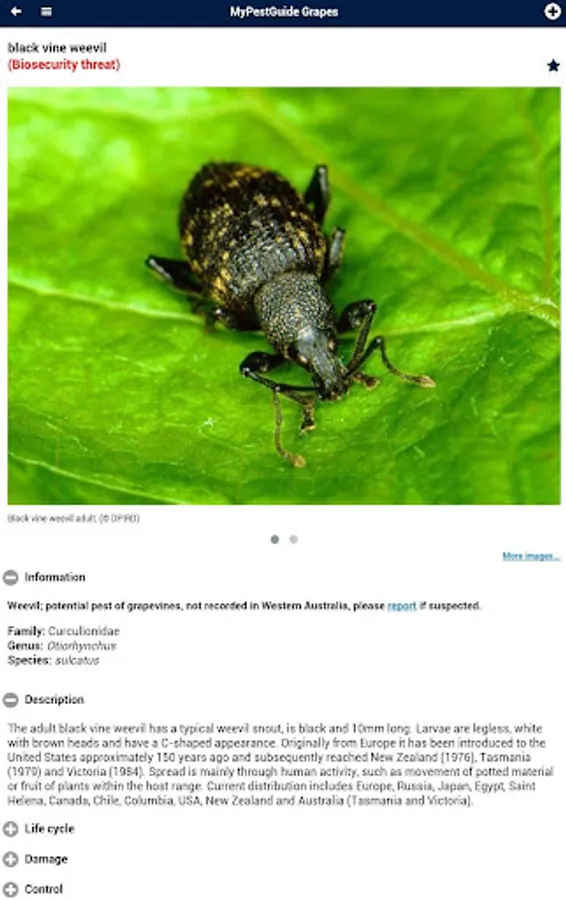 MyPestGuide Grapes lets you quickly identify pests of vines and grapes and report your observations instantly to the Department of Primary Industries and Regional Development (DPIRD).