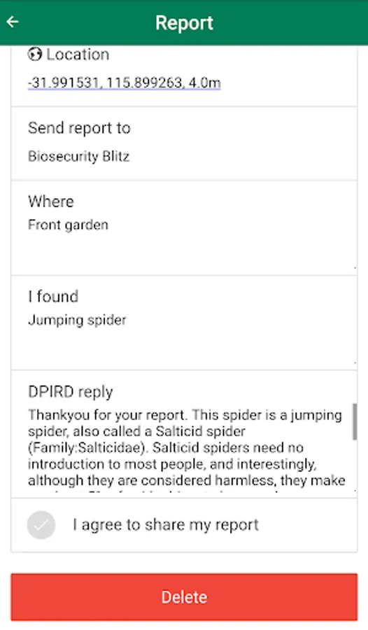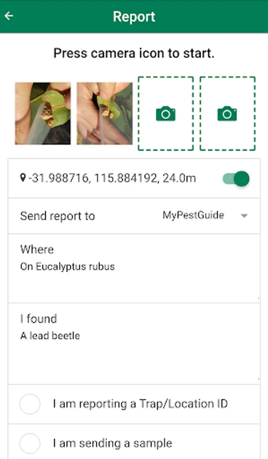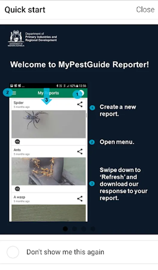 MyPestGuide Reporter lets you quickly report your observations instantly to the Department of Primary Industries and Regional Development (DPIRD). Everyone can help map pests by using your phone to make reports with up to four photos from your camera or gallery and gps. Our experts will attempt to identify your pest and reply back to your device. You can also create reports online using the MyPestGuide website.
