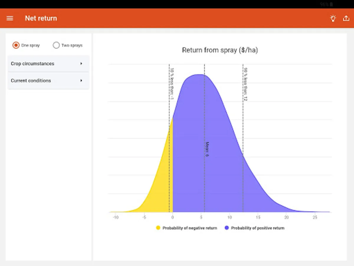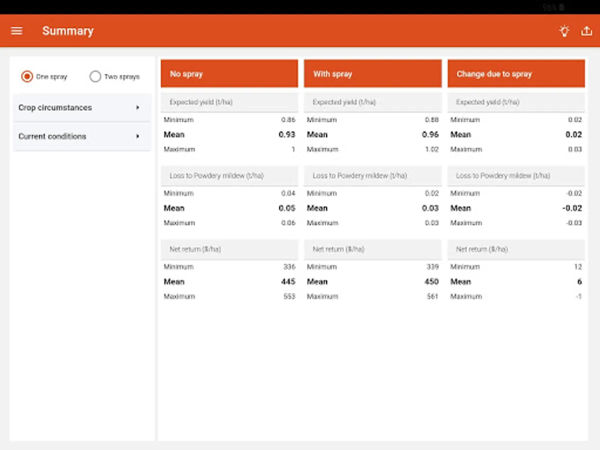 PowderyMildewMBM takes account of costs, yield benefits, grain price, and seasonal conditions to give you best case, worst case and most likely estimates of financial return.