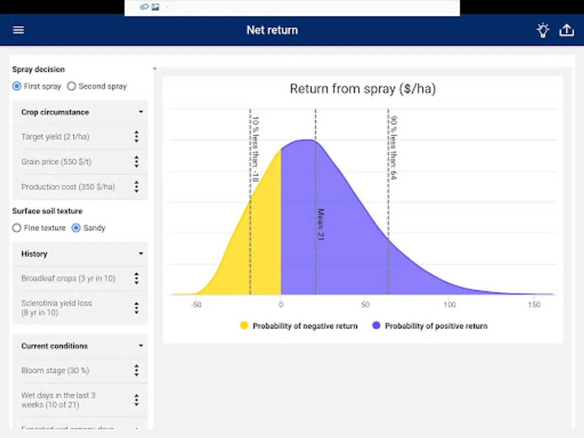 SclerotiniaCM takes account of costs, yield benefits, grain price, and seasonal conditions to give you best case, worst case and most likely estimates of financial return.