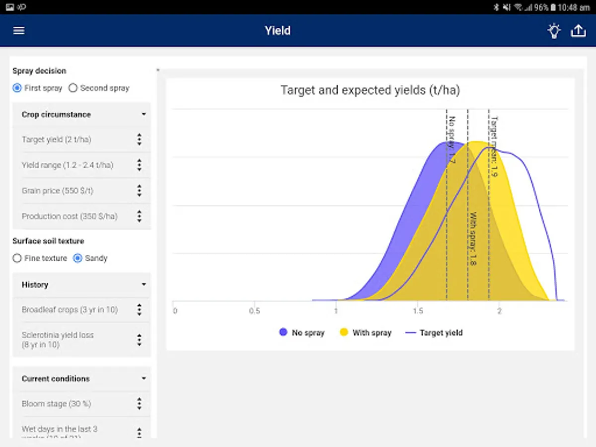SclerotiniaCM can be tuned to account for some of the major factors that relate to risk of yield loss due to sclerotinia disease in your paddocks. It allows you to compare the likely profitability of applying foliar fungicide.