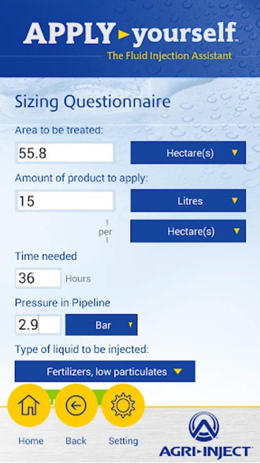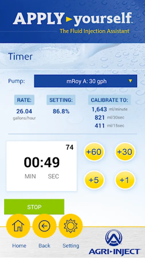 Apply Yourself comes pre-loaded with the complete range of injection pumps available from Agri-Inject. This allows the operator to easily enter the specific data points for his or her application — including field size, irrigation timing, injected liquid type and rate — and review a ranked list of the best pumps to fit that application. What’s more, the app provides both a photo and the details on each pump on the suggested list.