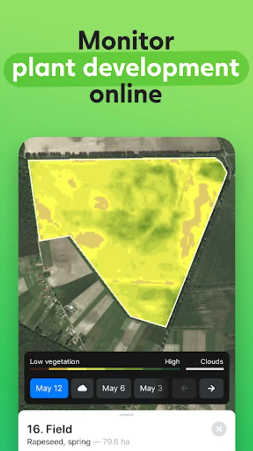 Track plant development, spot problem areas in fields, and evaluate fieldwork. The Agrilever DigiFarm app uses satellite imagery to calculate NDVI, an indicator of plant health.
