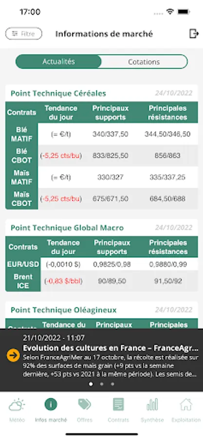 Market Info: consultation of Cereals technical points; Global Macro technical points; Oilseed Technical Points; Synthesis of cereals and oilseeds (daily market note on the previous day's session); Global macro synthesis. You will also find a "quotes" section where you can directly consult the Euronext quotations and the graphs of the various maturities.