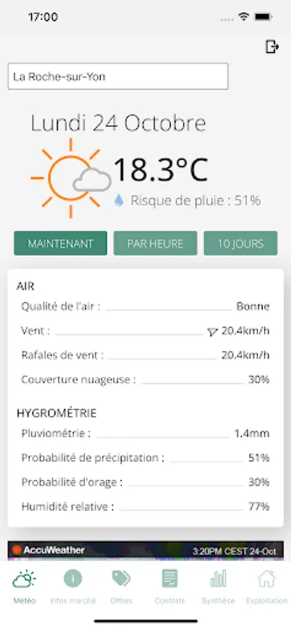 Agricultural Weather: reliable weather with several air and humidity characteristics. In addition, it will allow you to anticipate and plan your spraying thanks to 10-day forecasts. Finally, in this tab you will also find a rain radar which will allow you to know on which plots the shower will pass.