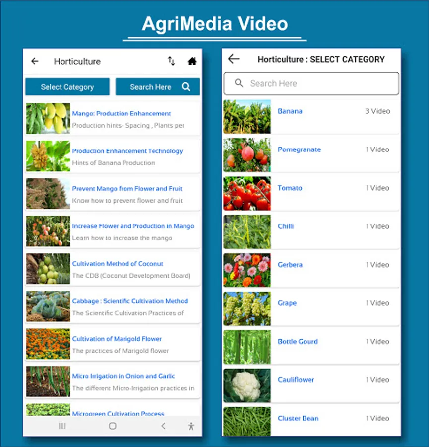In AgriMedia TV Video section has the collection of Agriculture, Horticulture, Animal Husbandry, Organic Farming, Rural Development, Technology, Success Story of farmers and Government scheme videos.