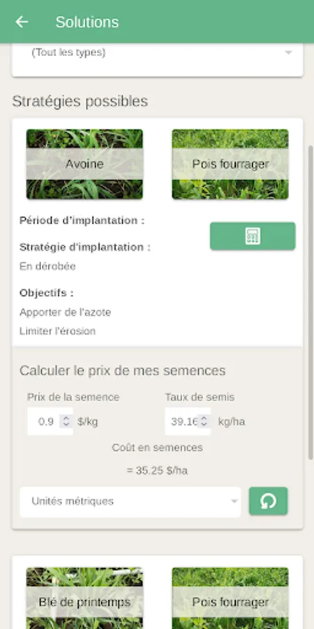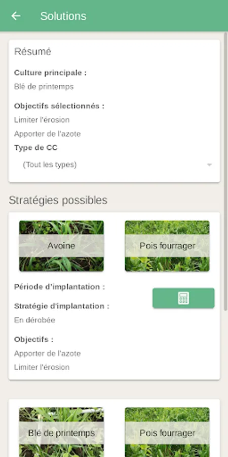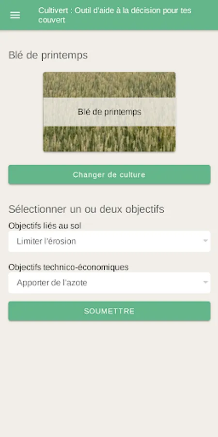 The Cultivert application makes it possible to develop strategies for establishing cover crops according to specific objectives: to explore and integrate new "companion plant-commercial crop" combinations into field crop rotations in order to promote better soil structure, nitrogen supply or better use of fertilizer inputs, for example, using numerous scenarios identified by the Agrinova team. These scenarios come from tests carried out in Chaudière-Appalaches and from scientific consultation.