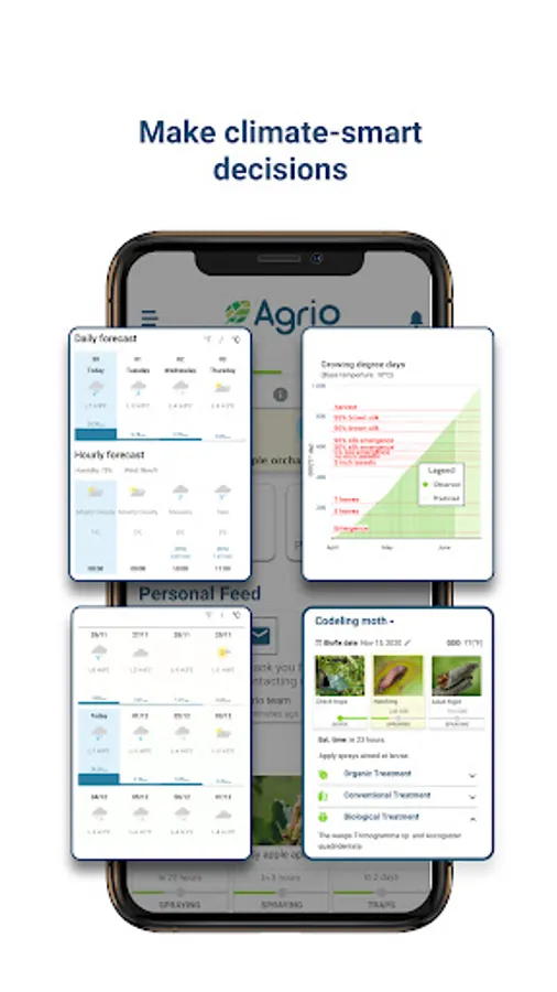 β οΈ Weather data. We provide you with an hourly hyper-local weather forecast with state-of-the-art accuracy. Track weather at the field level, and receive accurate alerts for potential plant diseases and pests. In addition, we calculate the growing degree days (GDD) for you to help you estimate the plant growth stage. We provide pest life-cycle modeling to help you optimize the timing of pesticide applications, and forecast new generation emergence.