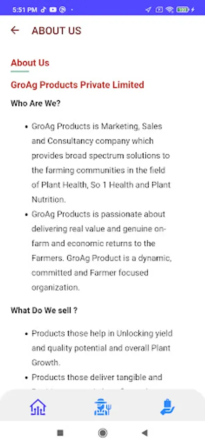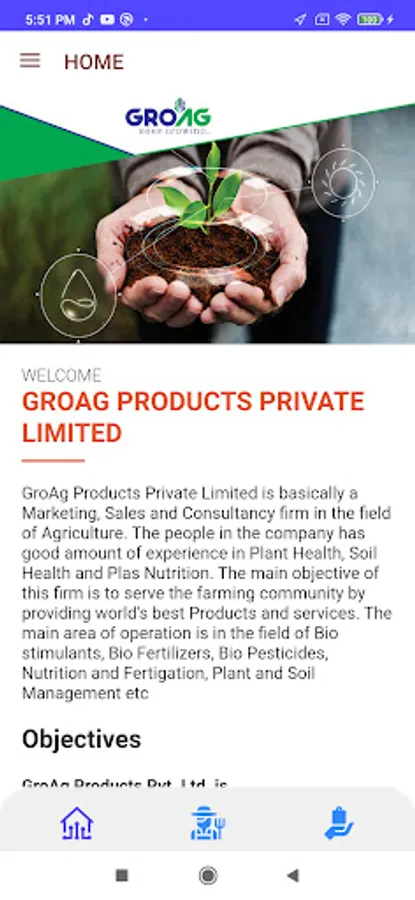 GroAg Products Private Limited is basically a Marketing, Sales and Consultancy firm in the field of Agriculture. The people in the company has good amount of experience in Plant Health, Soil Health and Plas Nutrition. The main objective of this firm is to serve the farming community by providing world's best Products and services. The main area of operation is in the field of Bio stimulants, Bio Fertilizers, Bio Pesticides, Nutrition and Fertigation, Plant and Soil Management etc