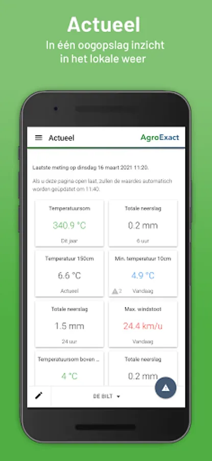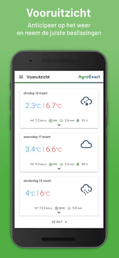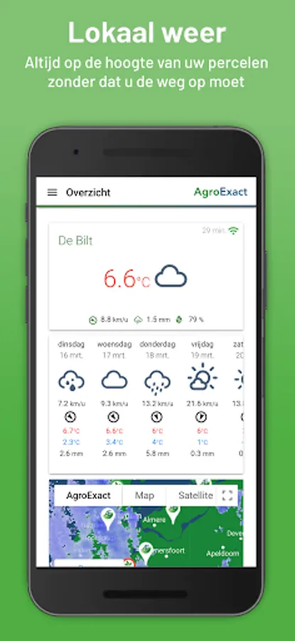 Via the app you can easily view the best weather information from our measurement network. Always measured locally: AgroExact places a weather station at your desired location free of charge if there is none within 2 km. And without hassle: installation and maintenance are included in the low annual amount, AgroExact divides the costs over the collective.