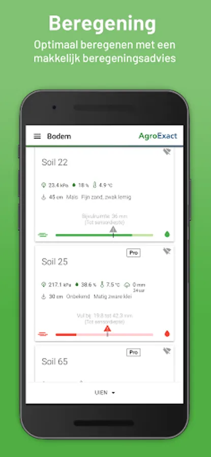 Combined in the same app is an easy irrigation advice that has been developed together with growers. This is based on the SoilExact soil moisture sensors that are available separately. This way you can see exactly how many millimeters of water your crop needs at what time and you can irrigate optimally.