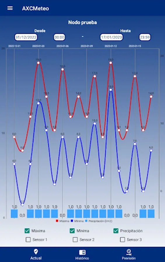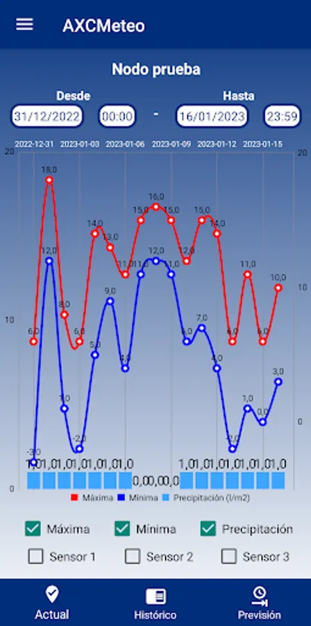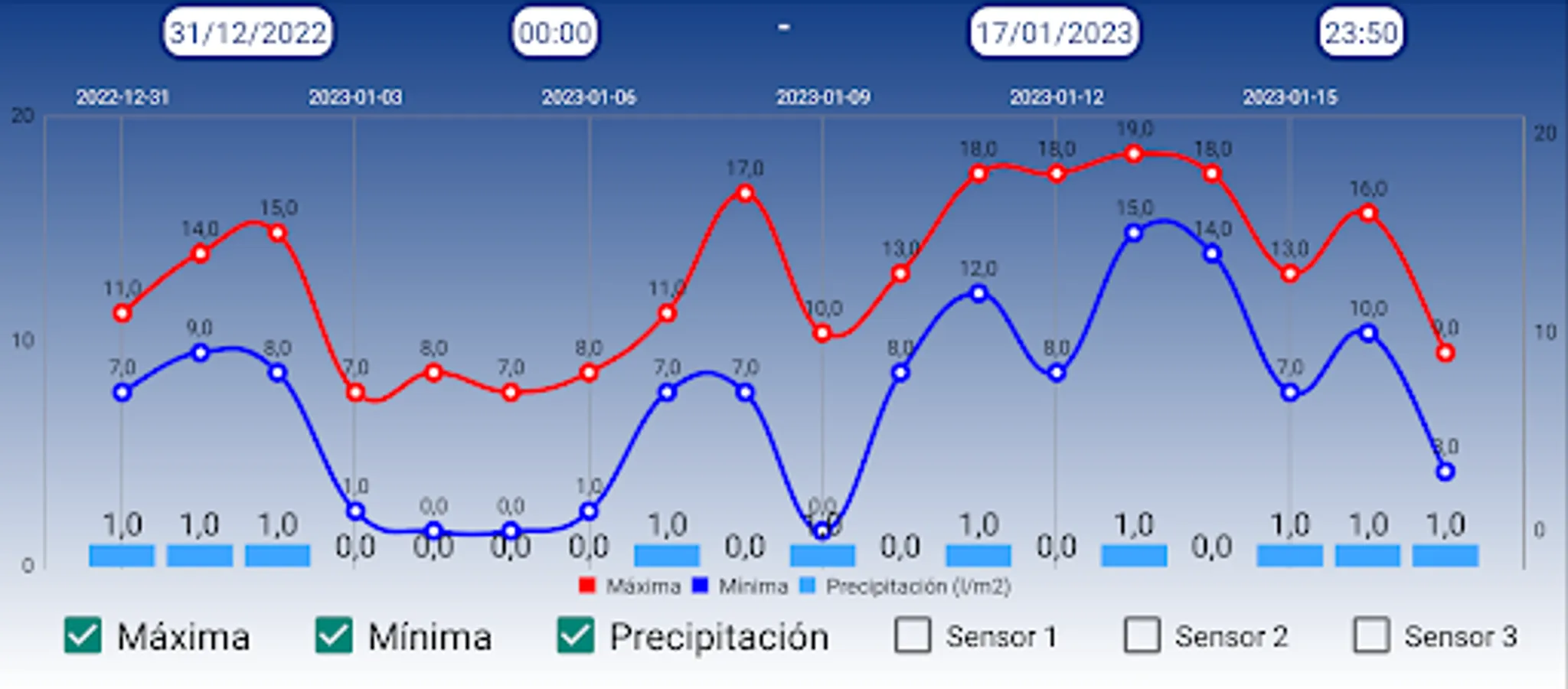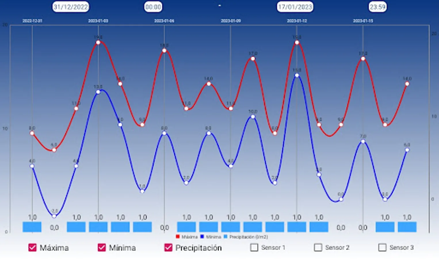 • See a dynamic history between the dates you want of the information received from the node, such as accumulated rainfall, maximum and minimum temperatures... In order to see only the information you need.
