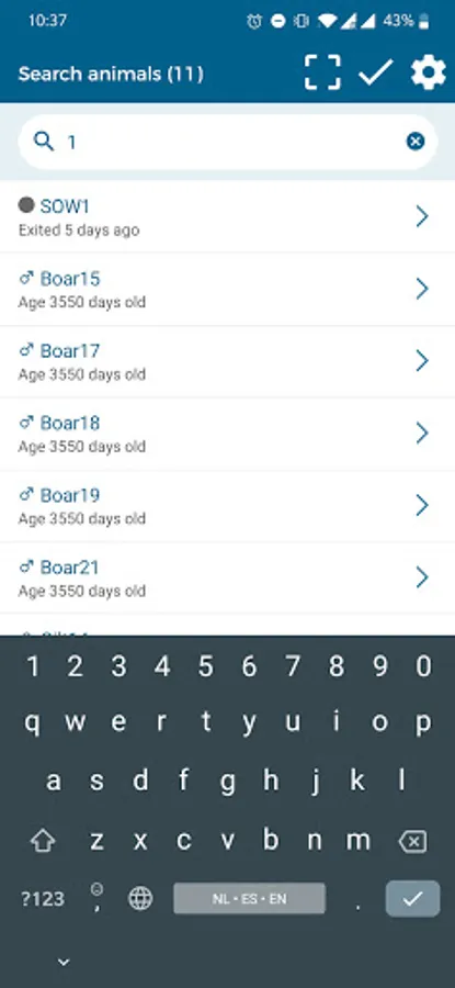 A sow can be selected quick by searching on sownumber, tatoo or sanitelnumber or use the barcode/QRcode scanner for the sow number or location. Also several RFID scanners are supported.