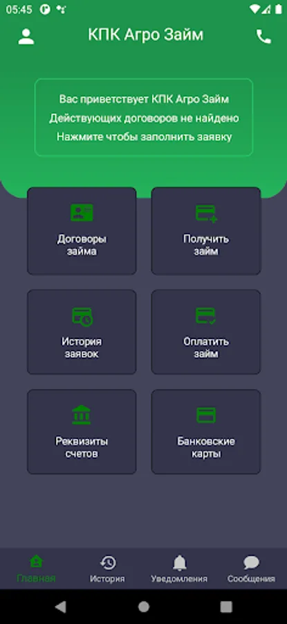 Using the application, you can leave an online application for a loan to a personal bank card, pay or extend an existing loan, obtain the necessary information from operators, view all documents and transactions performed under the current loan agreement.