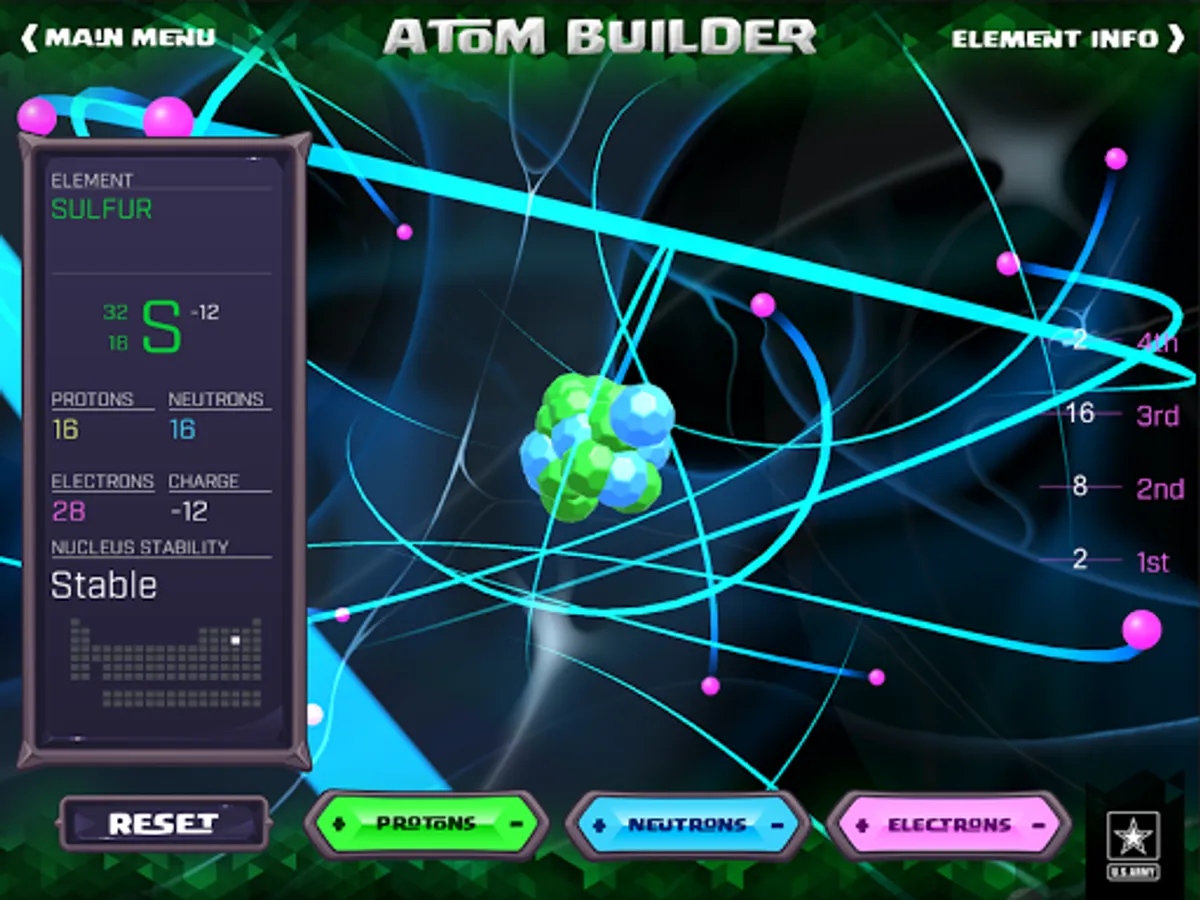 U.S. Army STARS Elements is a fun and exciting way to learn chemistry. Build your own atom, play a game to help you learn about chemical bonds, explore the periodic table, and test your chemistry knowledge. Elements is great for students, teachers, and anyone interested in chemistry.