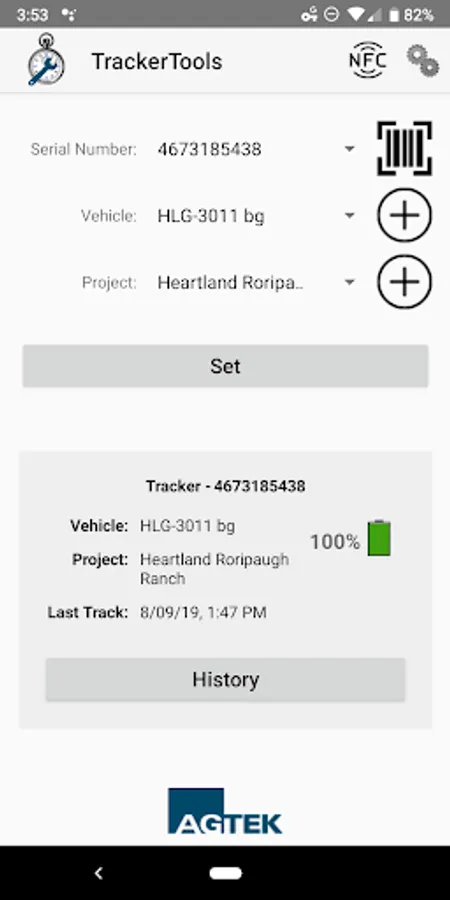 A support utility for AGTEK's latest track sensor, Tracker tools manages tracker and machine assignments to your projects. Scan the bar code, NFC tag, or pick from a list and instantly change what machine is being tracked or what project it is on. The history feature shows the current settings, battery status and allows editing of past tracks and machine assignments.